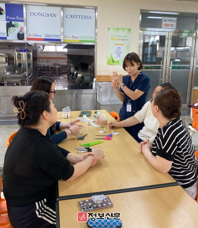 ![]() 근로자건강센터 물리치료사가 24일 광주동산초를 방문해 급식전담인력에서 테이핑 교육을 실시하고 있다. |
