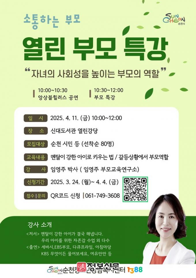 ![]() 순천시, 우아하게 자녀 키우기 「부모 특강」 개최 |