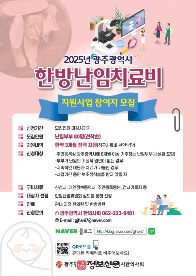 참여를 희망하는 난임부부는 광주시한의사회(062-223-9481)에 문의한 후 난임진단서, 참여신청서 등 관련 서류를 제출하면 된다. 이후 한의사회 심의를 거쳐 대상자가 선정되며, 지정된 한방 병·의원에서 3개월 간 집중 치료를 받을 수 있다.