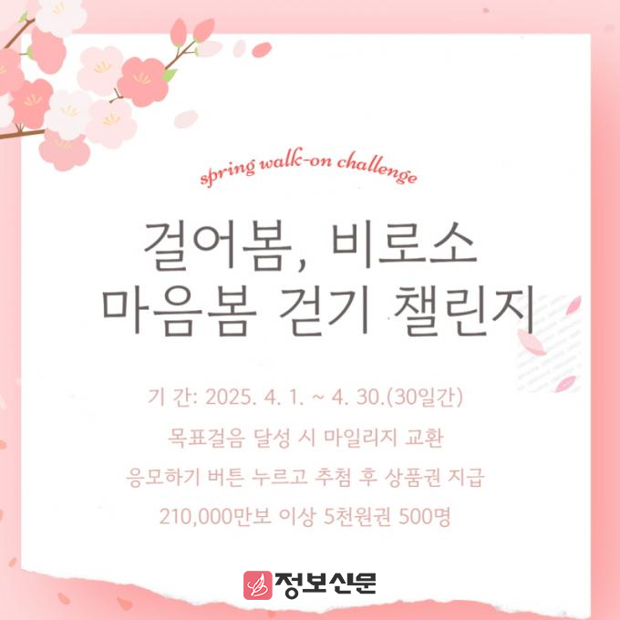 4월 1일부터 4월 30일까지 진행되는 이번 걷기 챌린지는 1걸음당 1마일리지 적립으로 1일 최대 8천 마일리지가 누적되며, 챌린지 기간 중 21만보를 걸으면 21만 마일리지가 쌓이고, 모바일문화상품권 5천원권 응모가 가능하다.