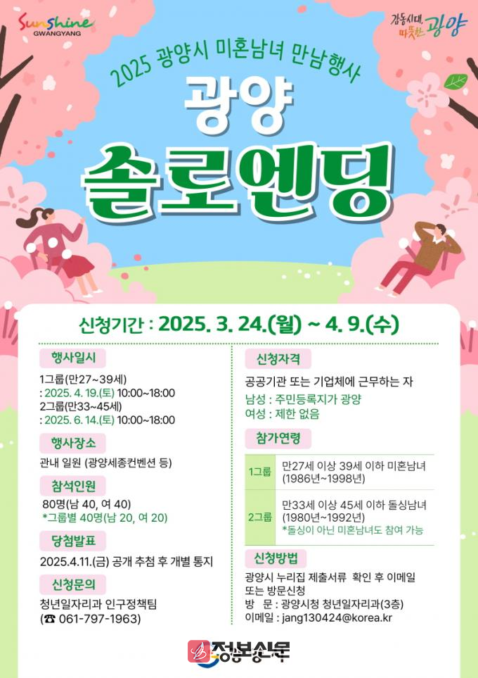 ![]() 광양시, 미혼남녀 만남을 위한 「광양 솔로엔딩」 참가자 모집 |