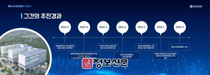 국립순천대는 2023년 9월 광양시와 글로컬대학30 사업 공동추진 협약을 체결하며, 지산학캠퍼스 설치의 첫발을 내디뎠다. 글로컬대학 최종 선정 이후 이듬해 3월 광양 포스코퓨처엠 등 관련 기업과 이차전지 공동교과목 운영 방안을 협의하고, 6월에는 광양캠퍼스 부지를 확정한 후 곧장 캠퍼스 구축 로드맵 수립에 착수했다. 이어 올해 1월에는 재학생 25명이 참여하는 ‘첨단소재 전문인력 양성 교육(비교과과정)’을 운영하며 본격적인 지산학캠퍼스 가동 준비를 마쳤다.