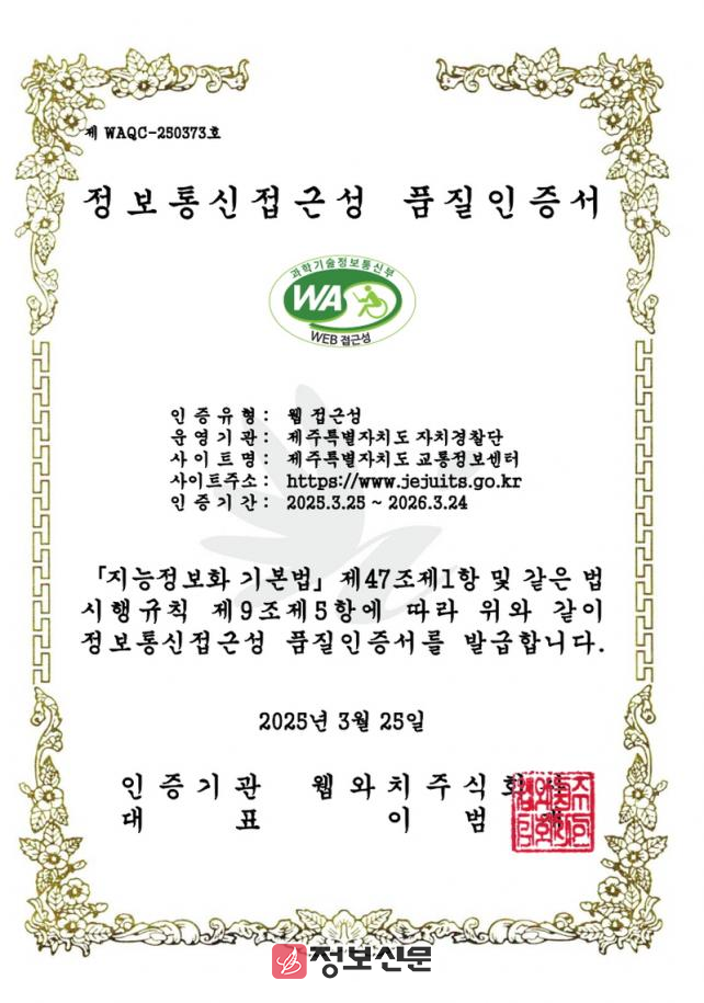 ![]() 제주특별자치도교통정보센터, 5년 연속‘웹 접근성 품질 인증’획득 |