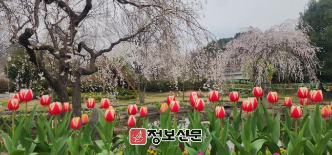 수양벚꽃이 하늘거리는 농업기술센터 시험포장 내에서는 라넌큘러스, 튤립, 비올라 등 15종의 형형색색 향긋한 봄꽃을 내달 20일까지 집중 전시한다. 봄꽃 전시장에서는 관엽, 허브, 다육·양치, 야생화 등 다양한 식물전시관을 거닐고 꽃벽, 꽃탑, 테마정원, 풍차정원, 초가집, 꽃 조형물 등에서 예쁜 인생사진도 건질 수 있다.