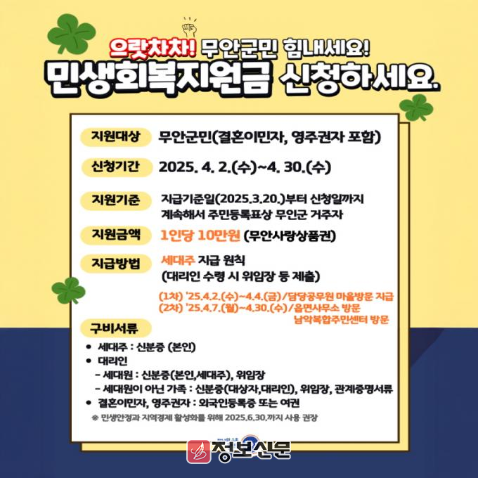 ![]() 무안군, 민생회복지원금 4월 2일부터 지급 |