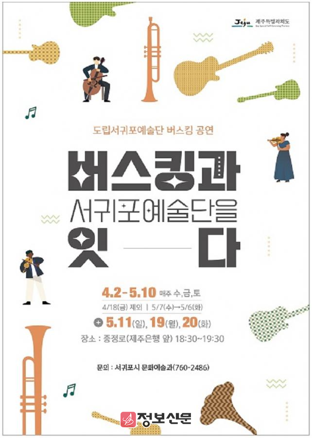 오는 4월 2일부터 5월 10일까지 매주 수, 금, 토요일과 5월 11일, 19일, 20일에 오후 6시 30분부터 약 한 시간 동안 서귀포시 중정로 제주은행 앞(중정로 67)에서 도립서귀포예술단(관악단, 합창단)의 다채로운 버스킹 공연이 펼쳐진다.