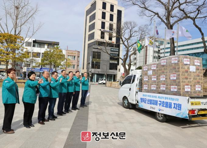 물품 전달식에는 박지원 국회의원과 명현관 군수, 이성옥 군의회의장, 윤치영 옥천농협 조합장 등이 함께해 산불피해 지역 주민들에게 위로와 격려를 전하고, 향후 지원방안에 대해 논의했다.