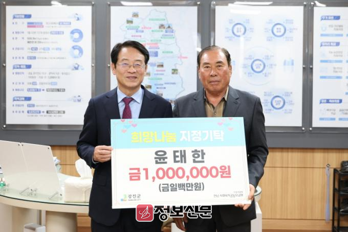 강진원 강진군수는 “해마다 지역사회를 위해 나눔을 실천해 주시는 윤태한씨께 깊은 감사를 드린다며 강진군도 나눔의 가치를 실현하며 모두가 더불어 잘 사는 지역사회를 만들어가겠다”고 말했다.