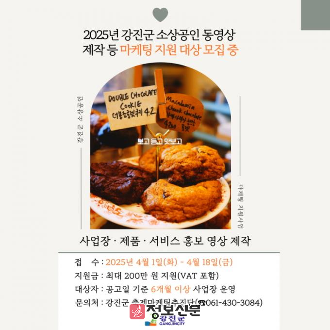 ![]() 강진군, 소상공인 맞춤형 ‘홍보 영상’ 제작 지원사업 추진 |