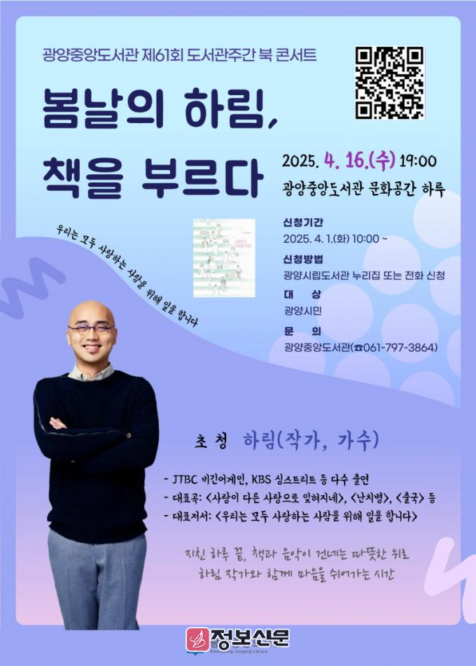 ![]() 광양중앙도서관, 작가 겸 가수 ‘하림’ 초청 ‘북 콘서트’ 개최 |