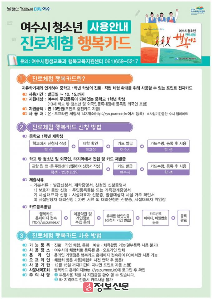 ![]() 여수시, 청소년 진로체험 행복카드 지원사업 추진 |