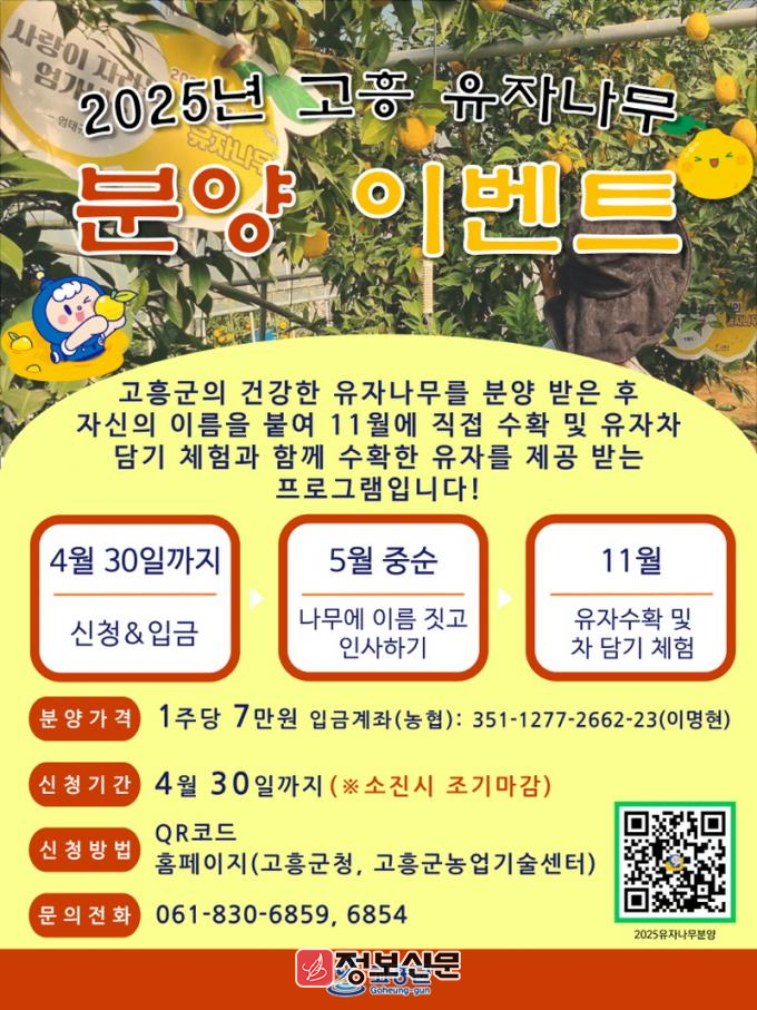 ![]() 고흥군, 2025년 유자나무 분양 이벤트 참여자 모집 |