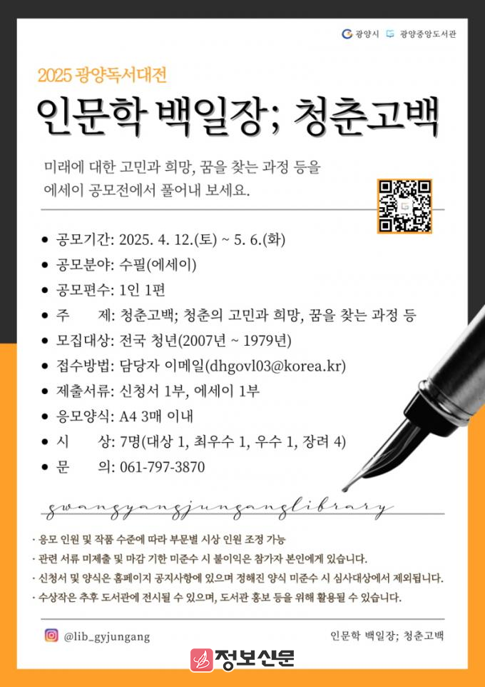 ![]() 광양중앙도서관, 「인문학 백일장; 청춘고백」 공모전 개최 |
