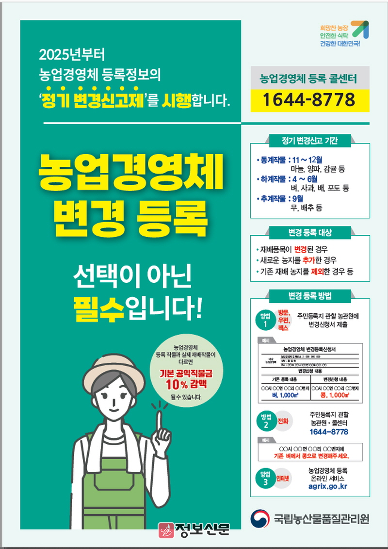 농업경영체 등록 농업인은 공익직불 등 농업 관련 융자·보조 사업* 지원혜택을 받는 대신 농어업경영체법 제4조에 따라 변경등록의 의무가 주어진다. 이는 정확한 농업경영체 등록정보를 토대로 정책지원을 추진하고 농산물 수급 등 정책 기초자료로 활용하는 등 농정 발전의 선순환 구조를 만들기 위한 방안이다. 하지만 바쁜 영농활동과 의무에 대한 인식 부족 등으로 농업인이 제때 변경등록을 하지 않고 있어 지원 사업에서 배제되는 등의 불이익을 받을 우려가 있다.