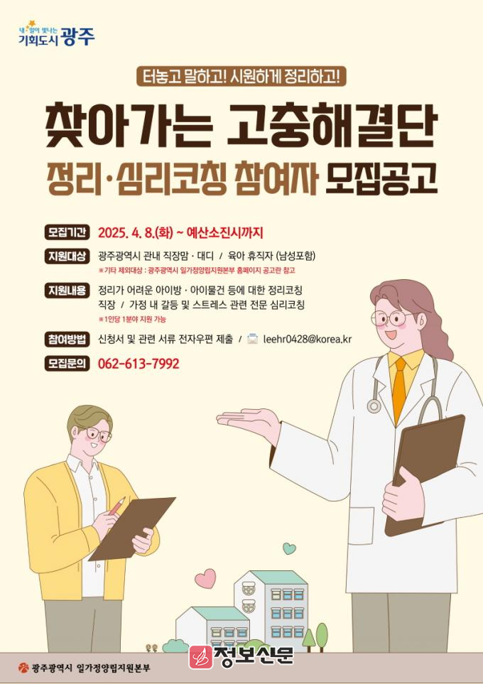 신청은 이메일(leehr0428@korea.kr)로 접수받으며, 예산 소진 때까지 가능하다. 자세한 내용은 광주시 일가정양립지원본부 누리집 공지사항(https://www.gwangju.go.kr/woman/boardList.do?pageId=woman56&boardId=BD_0000000164)에서 확인할 수 있다.