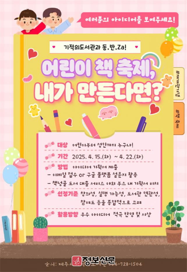 ![]() 제주시기적의도서관, 어린이 책 축제, 내가 만든다면?’ 아이디어 모집 |