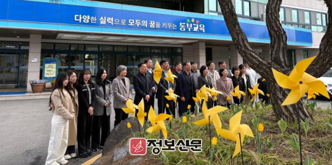 이명숙 교육장을 비롯한 전 직원들은 청사 화단에 노란 바람개비와 노란 리본을 설치하며 세월호 참사 희생자들을 추념하고, 안전한 사회를 만들기 위한 다짐의 시간을 가졌다.