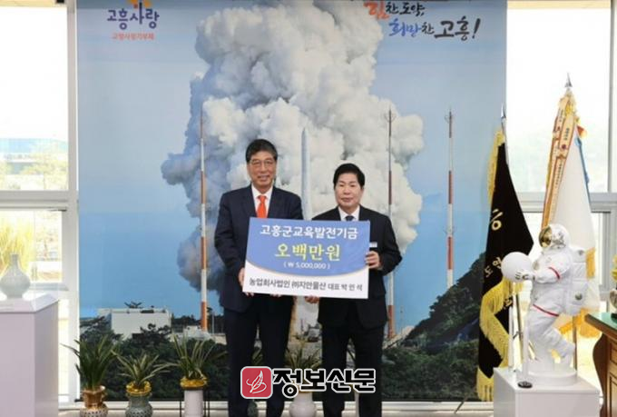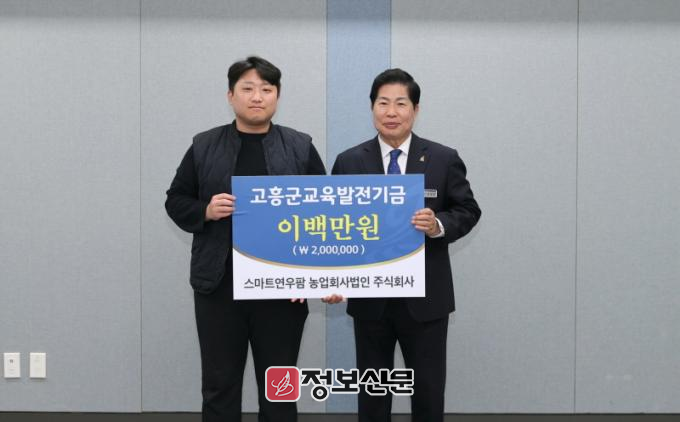 ![]() (사)고흥군교육발전위원회, 연이은 장학기금 기탁 줄이어(왼쪽부터 김선우 스마트연우팜 대표, 공영민 고흥군수) |