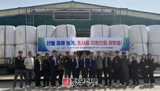 14일 나주시에 따르면 전국한우협회 나주시지부, 나주축산업협동조합, 나주시 조사료경영체협의회는 최근 1200만원 상당 볏짚 곤포 144롤을 경북지역 축산농가에 전달했다.