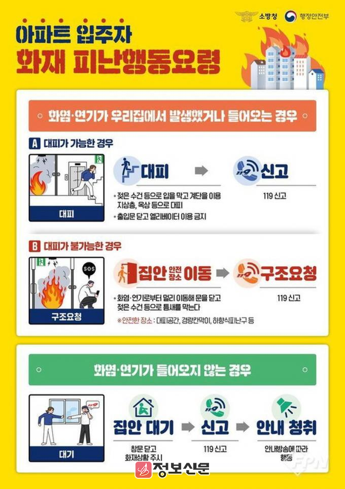 둘째, 화염·연기가 자택으로 들어오지 않는 경우 화재 상황을 주시하며 실내에서 대기한다. 이후 119 신고를 통해 상황을 알리고 아파트 안내방송에 따라 행동한다.