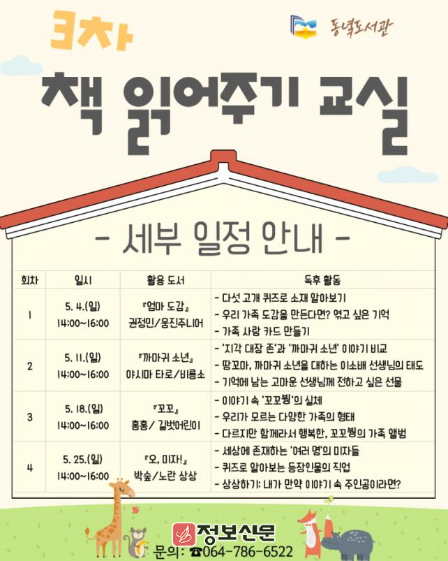 수강 신청은 오는 18일 오전 11시부터 제주특별자치도교육청 공공도서관 누리집(https://www.org.jje.go.kr)을 통해 선착순으로 모집한다. 수강 대상은 만 5세부터 초등학생 2학년까지 총 15명이며 운영 기간은 내달 4일부터 25일까지 매주 일요일 오후 2시부터 4시까지이다.