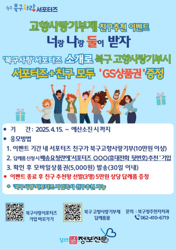 ![]() 광주시 북구, 고향사랑 기부제 친구 추천 이벤트 실시 |