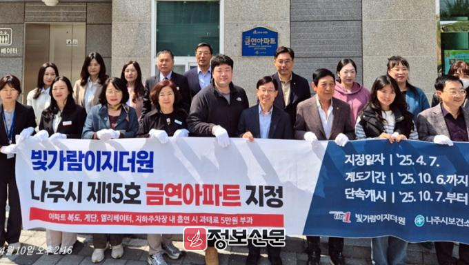 ![]() 나주시 보건소가 빛가람이지더원아파트를 열다섯번째 금연아파트로 지정하고 현판식을 개최했다. (사진제공-나주시) |