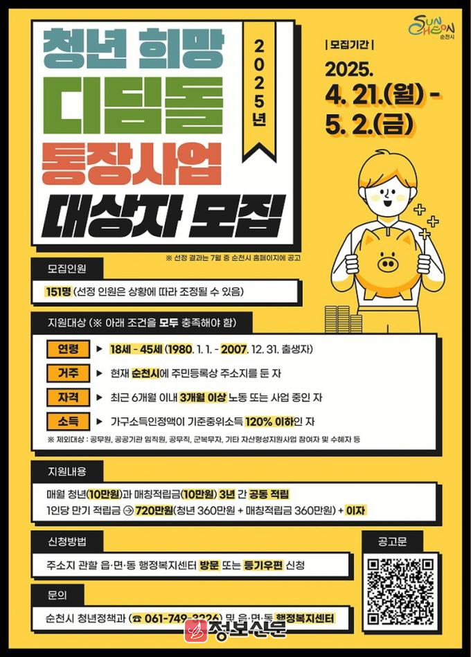 ![]() 순천시, 2025년 청년 희망디딤돌 통장사업 신규대상자 모집 |