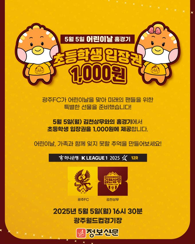 광주FC는 오는 5월 5일(월) 오후 4시 30분 광주월드컵경기장에서 열리는 김천상무와의 홈경기에 초등학생 입장권을 1,000원에 판매한다고 밝혔다.