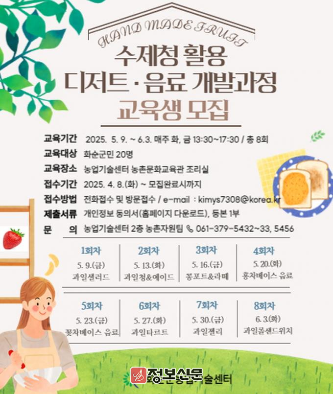 ![]() 화순군, 수제청 활용 디저트·음료 개발 교육생 모집 |