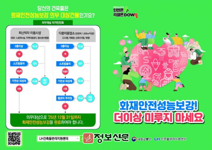 ‘화재안전성능 보강사업’은 화재안전 기준이 강화되기 전에 지어진 건축물의 안전을 확보하기 위해 불에 타기 쉬운 건축물의 외장재 교체와 스프링클러 설치 등을 지원하는 사업으로 올해 말까지 시행된다.