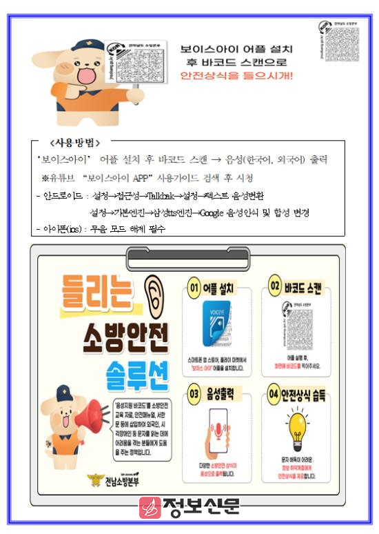 보이스아이는 전용 바코드를 통해 종이로 된 안내문이나 홍보물의 내용을 스마트폰에서 음성 또는 다국어로 출력해주는 애플리케이션으로, 강진소방서는 이를 이용해 화재 예방 포스터, 교육자료, 안내문 등 각종 홍보물에 바코드를 삽입하여 배포할 예정이다.