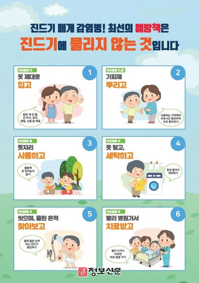 예방수칙으로는 ▲피부를 노출하지 않는 작업복 입기 ▲진드기 기피제 사용하기 ▲풀밭·풀숲은 피하기 ▲귀가 후, 씻고 빨래하기 등이다. 앞서 시는 이와 관련해 진드기 예방을 위한 팔토시 6,500개와 기피제 8,000개를 시민들에게 보급한 바 있다.