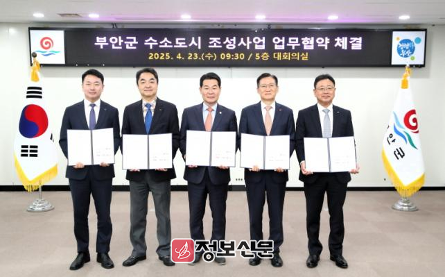 이를 위해 군은 23일 부안군청 5층 회의실에서 수소도시 조성 사업의 성공적 추진을 위한 5개 기관 업무협약(MOU)을 체결했다.