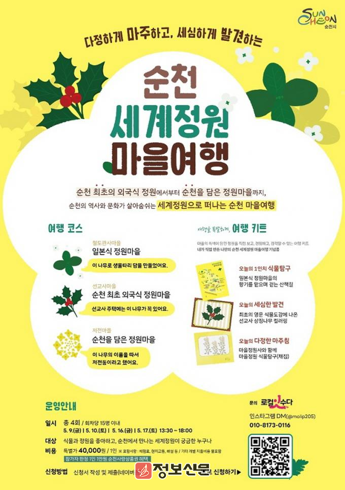 ![]() 순천시, 세계정원 마을여행 참가자 모집 |