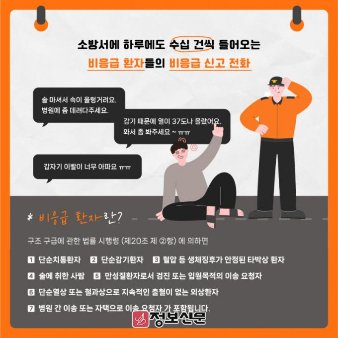 이같은 비응급환자로 인해 구급대가 출동하면 응급환자 발생한 상황에서 소방력 공백이 생겨 골든타임을 놓칠 수 있다. 현재 소방서는 ‘올바른 구급차 이용방법’ 홍보를 통해 ▲비응급환자 신고 자제 ▲신고 시 침착ㆍ정확한 상황 설명 ▲구급대원 병원 선정 존중 등을 안내하고 있다.