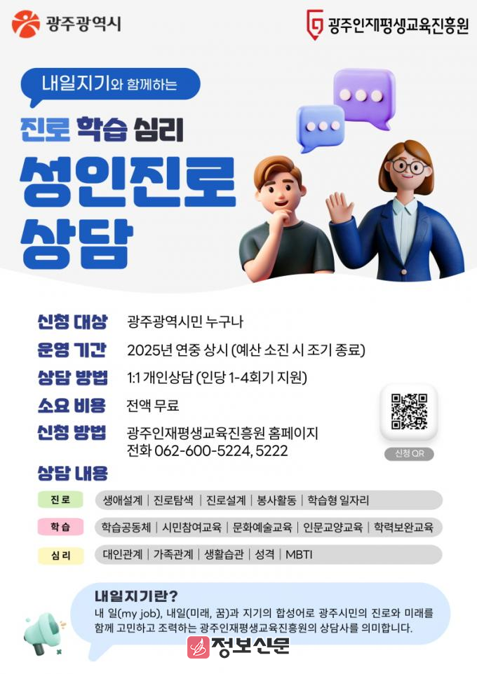 ![]() 광주인재평생교육진흥원, 성인진로상담 서비스 본격 운영 |