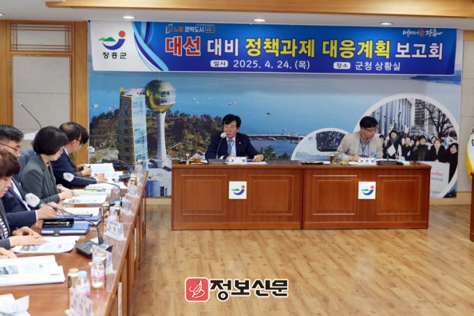 장흥군은 대선 일자가 확정됨에 따라 24일, 김성 장흥군수 주재로 대선 대비 정책과제 대응계획 보고회를 개최하였다.보고회에서는 장흥군 지역발전을 위한 정책과제 23건이 보고되었으며, 이들 과제의 총 사업비는 29,435억원 규모로 알려졌다.