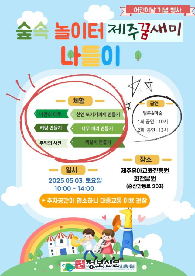 ![]() 제주유아교육진흥원, 어린이날 맞아‘숲속 놀이터 제주꿈새미 나들이’운영 |