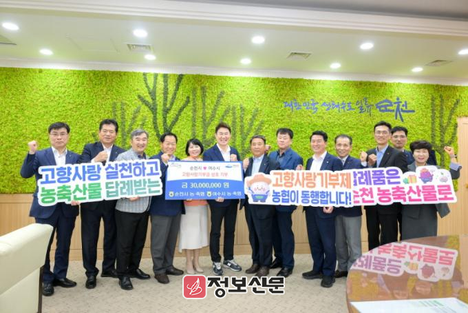 순천농협과 여수농협은 각 300명의 임직원이 참여해 각 3천만 원(1인당 10만 원 기준)씩 고향사랑 기부금을 상호 기탁하기로 했다.