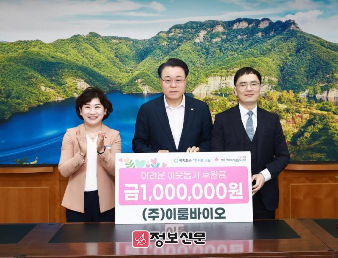 주식회사 이룸바이오는(이하 이룸바이오) 친환경 특허 기술을 이전받아 의료용 살충제를 전국 보건소에 납품하며, 매년 지역 발전을 위해 수익금 일부를 취약계층 후원금, 고향사랑 기부금 등에 사용하는 등 나눔을 선도하는 기업이다. 올해도 화순군 취약계층을 위한 현금 100만 원을 기부해 2년 연속 기록을 쌓았다.