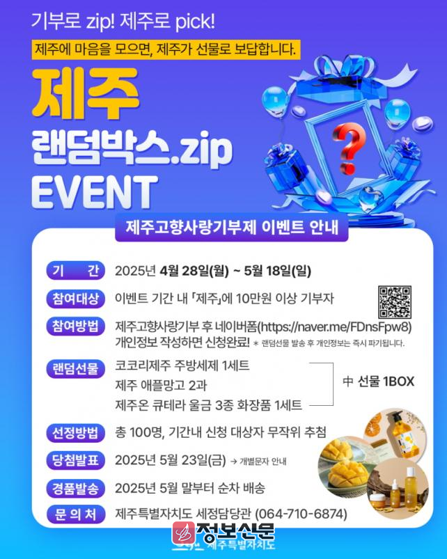 ![]() 제주특별자치도, 고향사랑기부자 제주랜덤박스.zip 이벤트 진행 |
