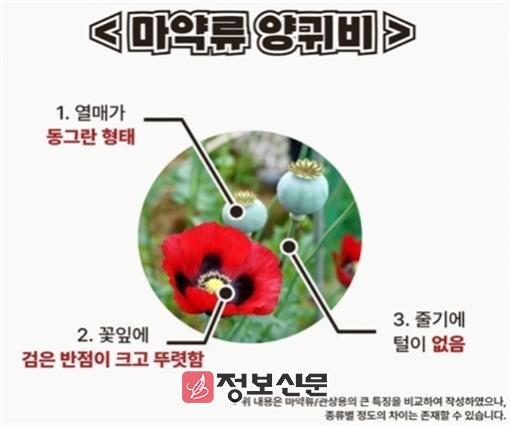 양귀비는 즙을 가공하여 모르핀, 헤로인, 코데인 등 마약으로 악용될 수 있는 마약 양귀비와 마약성분이 없는 관상용 꽃(개)양귀비로 나뉘며, 특히 마약 양귀비 중 나도양귀비는 제주 지역에 자생하고 있는 종으로 관상용 양귀비와 비슷해 주의가 필요하다.