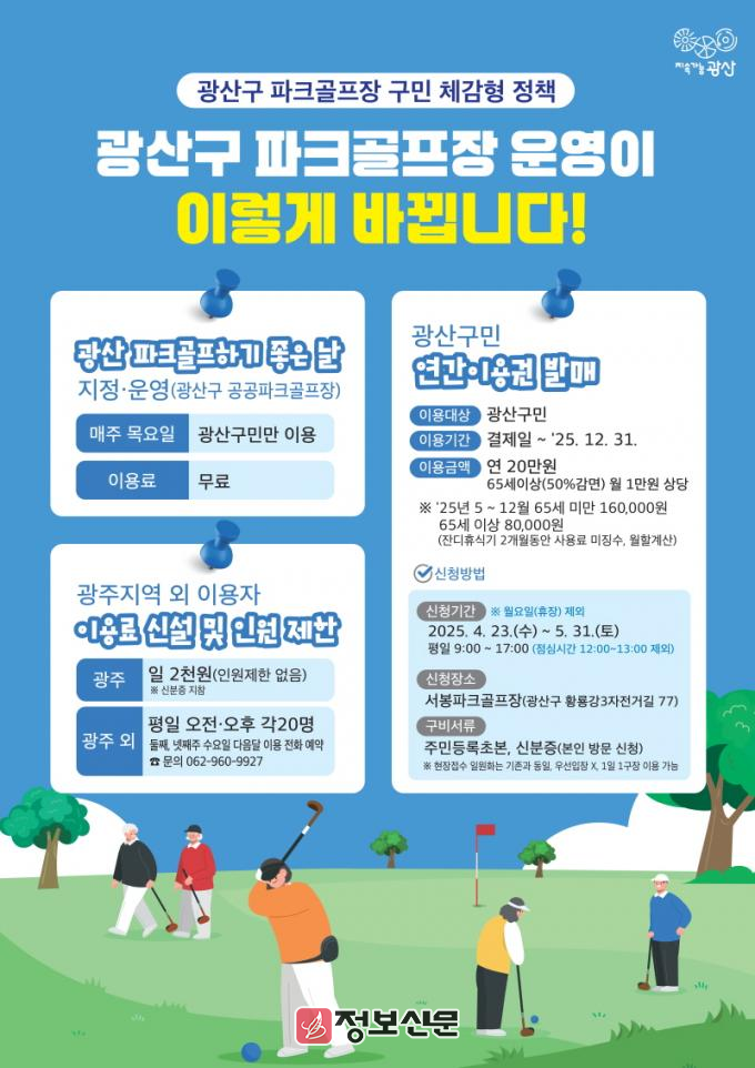 광산구는 연간 이용권 운영으로 구민 혜택을 강화하고, 고질적 민원으로 제기됐던 줄서기 문제가 해소될 것으로 기대하고 있다. 연간 이용권 신청 접수는 서봉파크골프장(황룡강3자전거길 77)에서 한다.