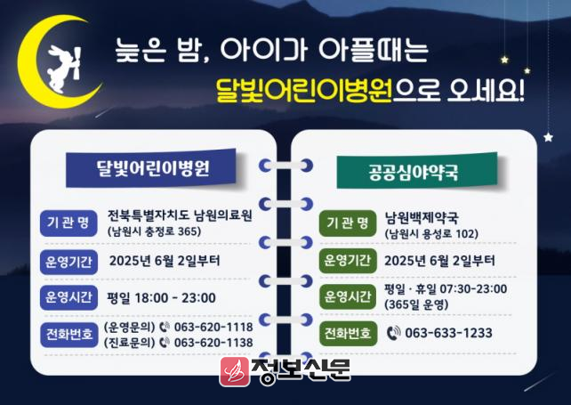 이번 지정에 따라 남원의료원은 전국 최초로 지방의료원이 달빛어린이병원 지정기관으로 선정되었으며, 6월 2일부터 평일 오후 6시부터 밤 11시까지 야간 소아청소년과 진료를 제공하게 된다. 특히 이 진료는 소아청소년과 전문의가 직접 참여해 신뢰도 높은 진료가 이뤄질 예정이다.