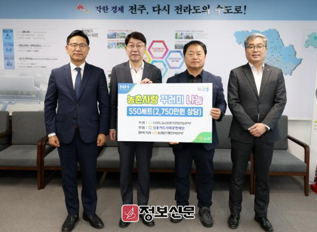 전주시와 (사)도농상생국민운동본부는 30일 전주시장실에서 우범기 전주시장과 박병철 NH농협 전북지부 노동조합 위원장, 김성훈 NH농협은행 전북본부장, 하양진 NH농협은행 전주시지부장 등이 참석한 가운데 소외된 이웃들을 위한 2750만 원 상당의 우리 농산물 꾸러미 550세트를 후원키로 하는 기부전달식을 가졌다.