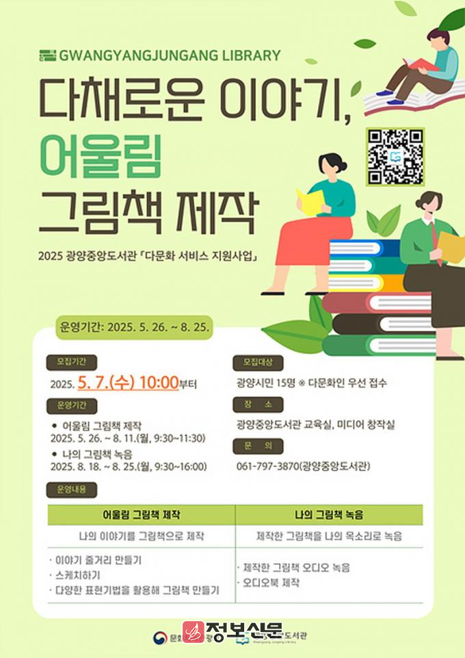 ‘다채로운 이야기, 어울림 그림책 제작’은 광양시 거주 다문화인 누구나 참여할 수 있으며, 5월 7일부터 광양시립도서관 누리집 또는 전화(☎797-3870)를 통해 신청 가능하다. 프로그램 세부 일정과 운영 방식 등 자세한 사항은 전화 문의를 통해 안내받을 수 있다.