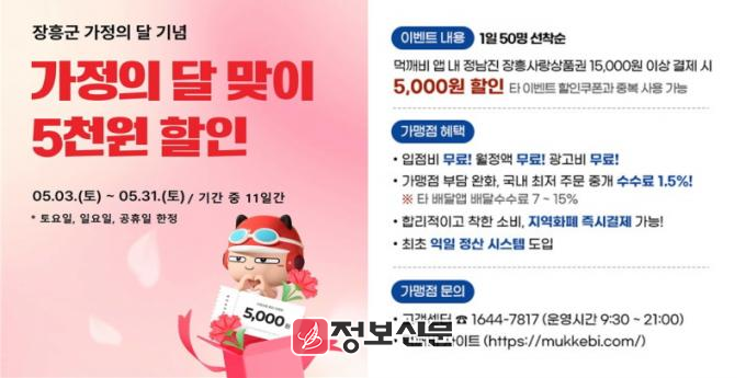 이번 할인 이벤트는 5월 한달간 먹깨비 앱을 통해 매주 토요일과 일요일(공휴일 포함) 장흥사랑상품권 1만 5천원 이상 주문 시 5,000원 할인쿠폰(1일 50매)을 제공한다.