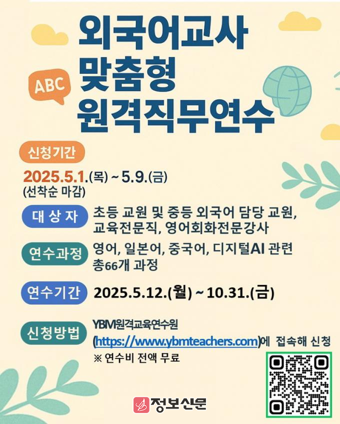 대상은 초·중등 교원 및 교육전문직원이다. 연수는 ▲영어 교수법, 문법, 어휘, 독해, 작문, 회화 등 46개 ▲일본어회화 6개 ▲중국어문법·회화 7개 ▲디지털·AI 7개 등 총 66개 과정으로 운영된다.
