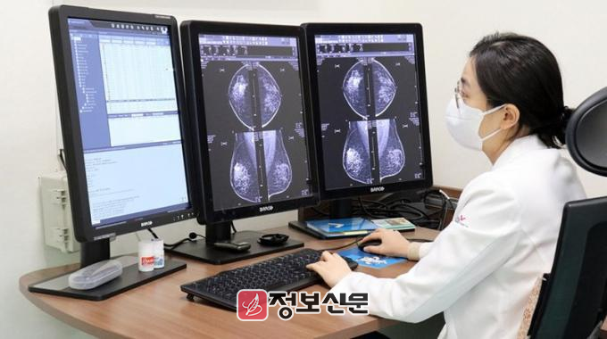![]() ▷ 한국건강관리협회 의료진이 유방암 진단AI솔루션을 활용해 영상판독을 하는 모습(제공: 한국건강관리협회 광주전남지부)